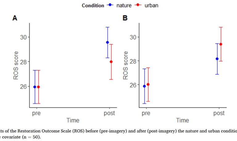 The study "The Restorative Effects of Mental Imagery of Nature: A Study on Subjective and Physiological Responses" investigates how imagining natural environments aids stress recovery. Results show that nature imagery significantly enhances subjective feelings of relaxation and physiological indicators of relaxation, such as heart rate variability, compared to urban imagery. Participants with a stronger connection to nature experienced amplified restorative effects. These findings highlight nature imagery as a potential, cost-effective therapeutic tool for stress management, suggesting that even mental engagement with nature can foster relaxation and well-being.